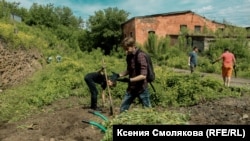 Владелец юрфирмы Дмитрий и девятиклассник Артем на солнцепеке пытаются сдвинуть бетонную крышку колодца так, чтобы ее можно было использовать как стол. Она лежит в зарослях кустарника и не поддается. На помощь спешат десятиклассник Саша и архитектор Александр Деринг. В группе поддержки блогер Евгений Кучинев и еще несколько ребят. Двух ломов для такой работы оказывается мало, поэтому еще два дает кузнец Андрей Чаплыгин – его мастерская разместилась среди старинных руин Сереброплавильного завода.