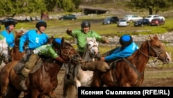 Фермер Валерий Каменев из команды Купчегеня переехал в эти места недавно. Был инспектором в Каракольском природном парке "Уч-Энмек", а потом начал разводить лошадей. Уже год он увлеченно играет в кок-бору, легко переходит с русского языка на алтайский и пользуется уважением среди местных. К Каменеву подходят люди, знакомятся и жмут руку. Он по-алтайски приветствует их, охотно отвечает на расспросы, а алтайцы на русском желают ему здоровья.