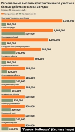 В 59 регионах из 83, анализируемых "НеМосквой", выплаты за участие в войне с Украиной для тех, кто подписывает контракт с Министерством обороны, увеличились.