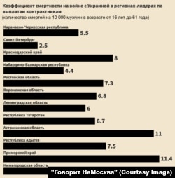 Если сравнить топ российских регионов – аутсайдеров по выплатам за войну с индексом смертности на войне (количество смертей на 10 000 мужчин в возрасте от 16 лет до 61 года – опубликован в совместном проекте "Медиазоны" и BBC), то мы увидим, что платят там мало, а гибнут много.